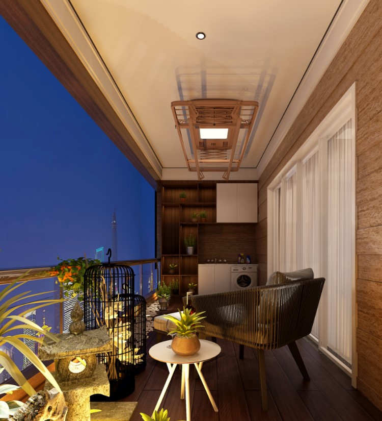 在本次金企鹅美居设计大赛中,一等奖设计师曾炎威将阳台原有的护栏,改为上部可推拉式落地窗,且不影响采光通风的条件下也保证了业主的私密性及安全感。在空间布置上以地面材料的形式划分为休闲区和工作区。休闲区地面为仿实木木纹砖,工作区域为黑、白、浅灰三种颜色的六角砖,黑白灰与原木肌理的交织使空间营造出的一种生机与美感,墙面的米黄暖色基调,融入乐鱼智能晾衣机,实用、简约,展现阳台的无限可能。