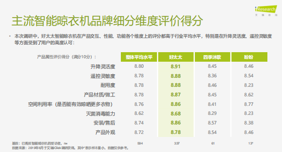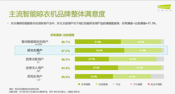 购买智能晾衣机消费者,对乐鱼智能晾衣机所使用产品的满意度最高达到97.3%,且从晾衣机升降灵活度、遥控灵敏度、耐用度、灭菌消毒能力等多个维度上看,都是高于整体平均水平。
