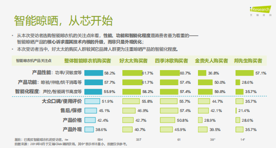 从本次受访者选购智能晾衣机的关注点来看,性能、功能和智能化程度是消费者最为看重的,智能晾晒产品的核心诉求是其技术内核的升级,而非只是外观优化。