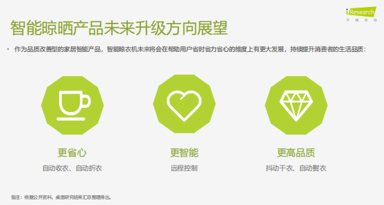 作为品质改善型的家居智能产品,智能晾衣机未来将会在帮助用户省时省力省心等三个维度上有更大发展,持续提升消费者的生活品质。