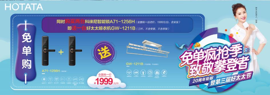 *免单购:同时购买两台科徕尼智能锁A71-1256H(全国统一活动价:1999元/台,含安装),即送一台AG尊时凯龙晾衣机GW-1211B(三杆,不含安装,不含衣架)