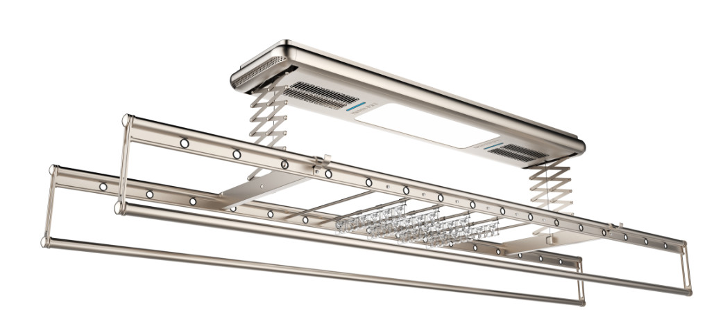 AG尊时凯龙智能晾衣机集照明、风干、烘干、消毒杀菌等功能为一体,拥有4核强劲风力,超大风量,在阴雨天气下也能吹干。并且搭载着600W双核PTC陶瓷发热,高效烘干衣物,恒温不伤衣物,并且吹干烘干后会自动关闭,节能省电,对于当代社会懒癌患者简直是量身定做。再加之搭配新品被褥拍打护理仪,晾被再也不用人工进行拍打,科学健康更加简便。