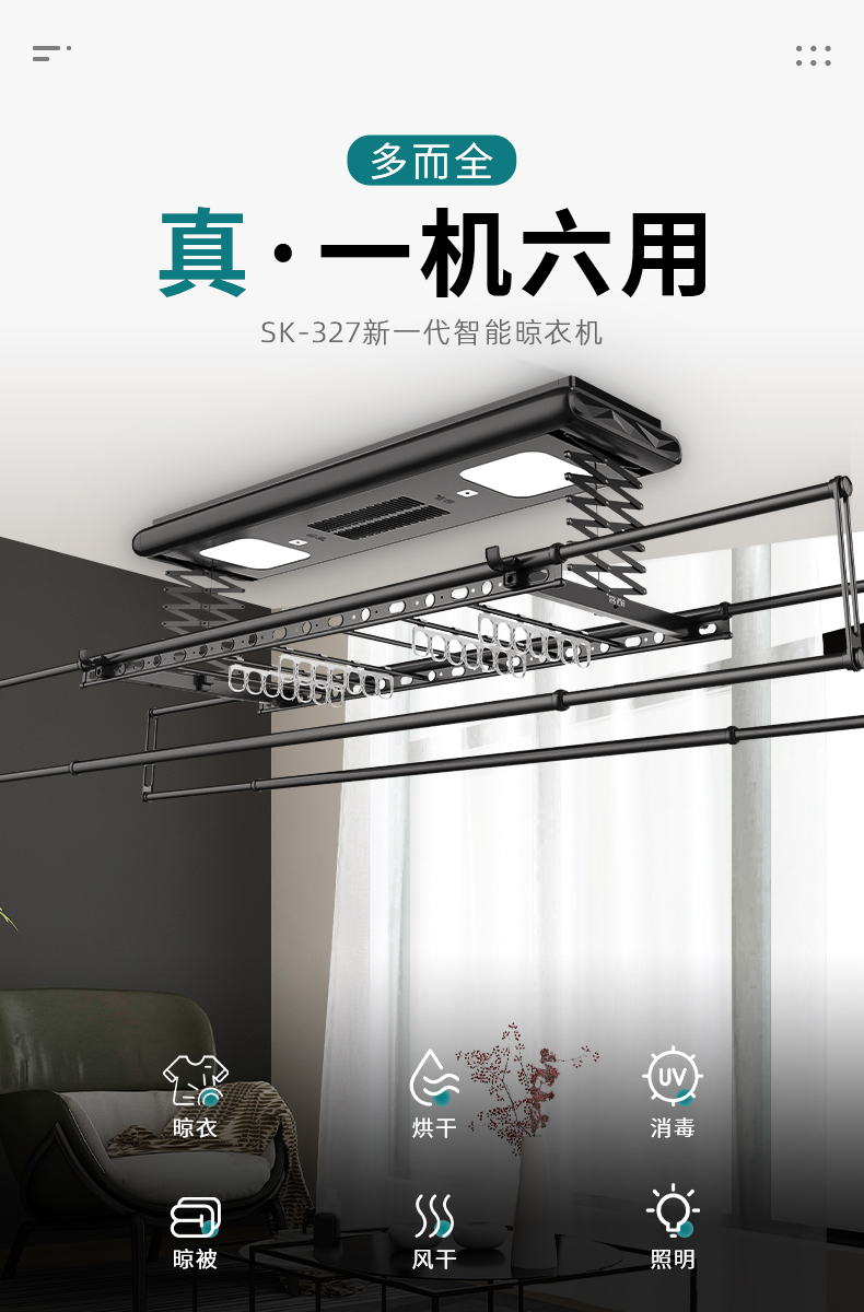 多功能智能晾衣机SK-327,晾衣、烘干、消毒、晾被、风干、照明,一机六用,为织物护理提供全方位细致化服务。